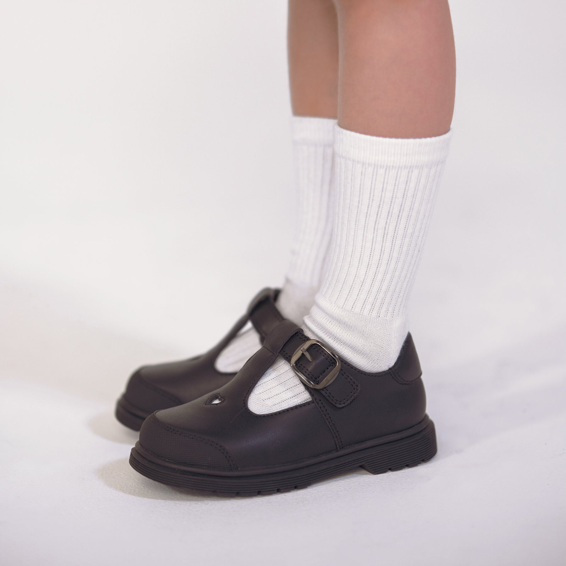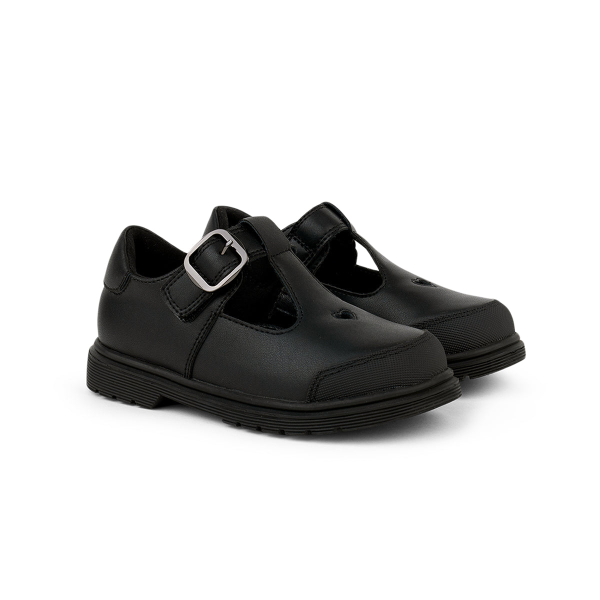 Pretty Brave Athena is a classic girls T-bar school shoe with a timeless silhouette and thoughtful design. Featuring a heart cut-out on the vamp, reinforced rubber toe cap, ankle strap with black nickel buckle and hidden hook and loop fastening, Athena offers comfort, charm and a secure fit for everyday wear.